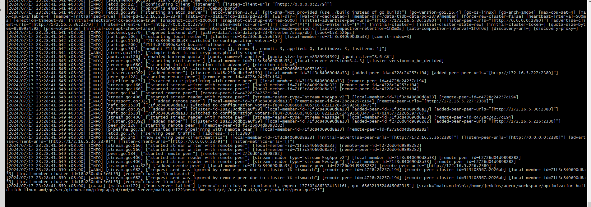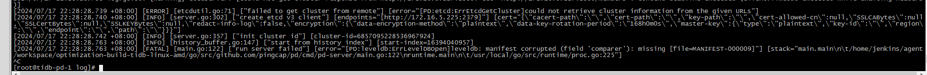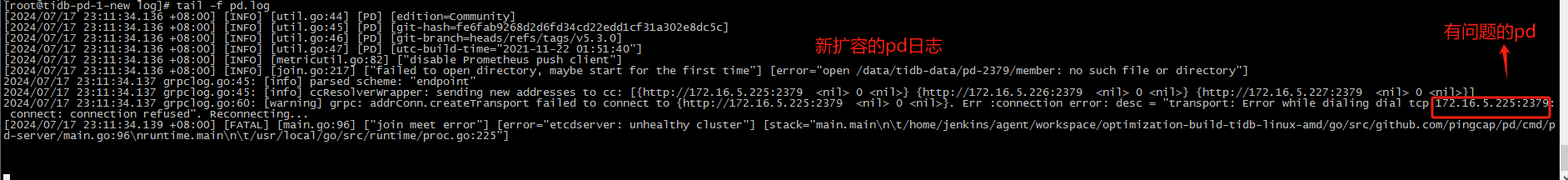 4、考虑到225的pd已挂,于是决定先扩容一台pd(ip为172.16.5.36,以下简称36),但执行完扩容命令后起来不,新的pd日志报错如下: