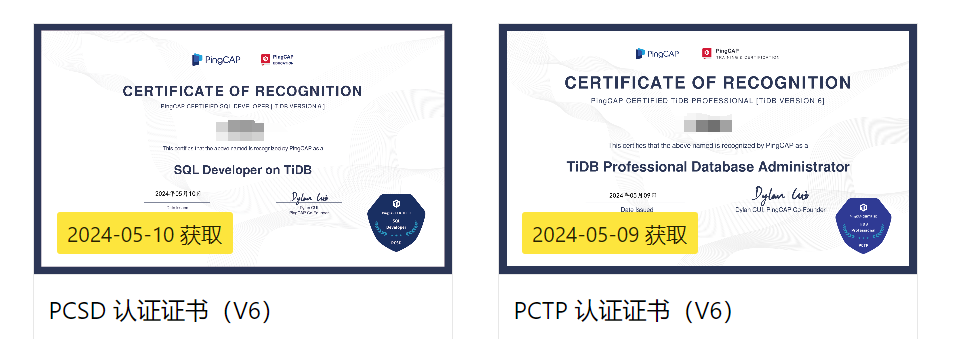 刚开始,并没有想到参加相关考试,也对自己没有太大信心。正好赶上24年的官方活动,还是决定挑战一下自己。其实时间比较紧凑,因为留给自己的只有一个多月的准备时间,而且平常还要忙于开发工作,所以大部分时间都是每天晚上抽取2个小时左右去学习,以及周六周末。经过一段时间的准备和努力,感觉自己还是很幸运的。最终成功地考取了PCTA、PCTP、PCSD三个证书。这些证书不仅是对自己学习成果的肯定,也为tidb的日常运维打下了坚实的基础。