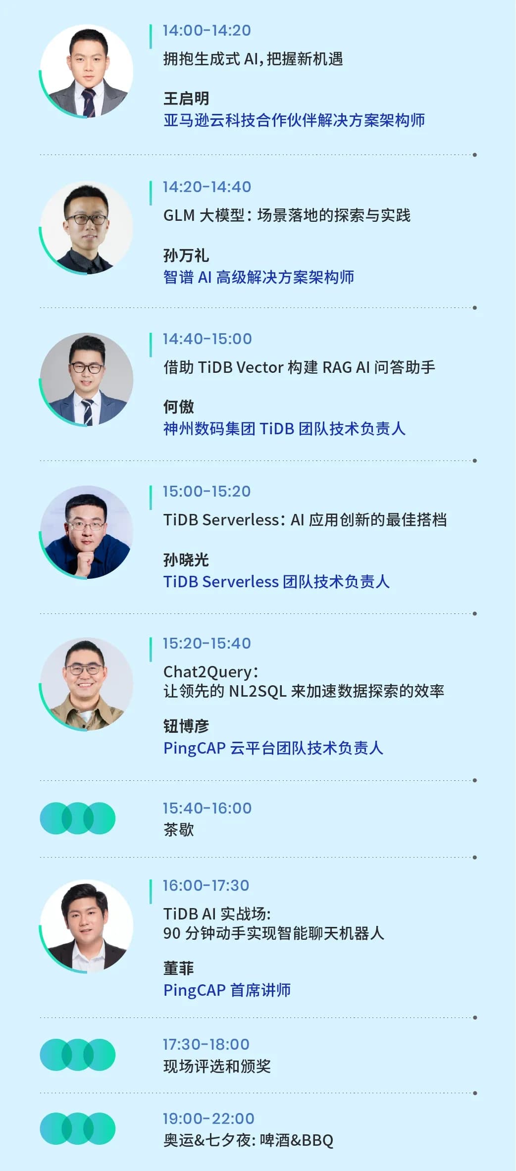 相聚在七夕节的下午,一起分享干货、现场演练!来自 PingCAP、亚马逊云科技、智谱 AI 的技术专家们将分享他们在 AI 时代的探索和观察,来自神州数码的社区用户将分享他使用 TiDB Vector 的真实体验;我们还准备了动手实操环节, 90 分钟亲手实现你的智能聊天机器人!