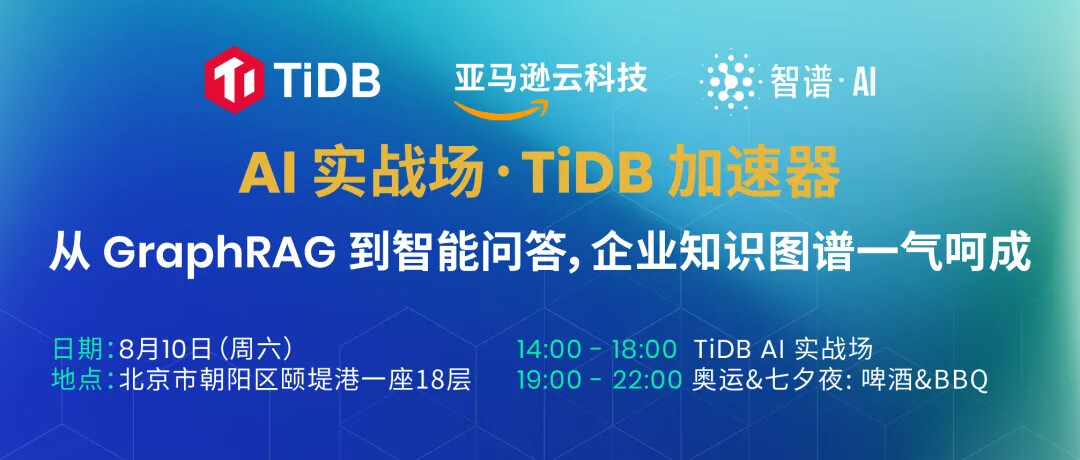 AI 的热潮一浪接一浪,无论是从上至下的战略方向,还是自下而上的内部创新,都离不开 AI 这个火热的话题。北京,一直是 AI 创新的最前沿,创新指数排名全国第一,全球第二。为此,8 月 10 日 TiDB 联合亚马逊云科技、智谱 AI 在北京举办一场 AI 实战场。
