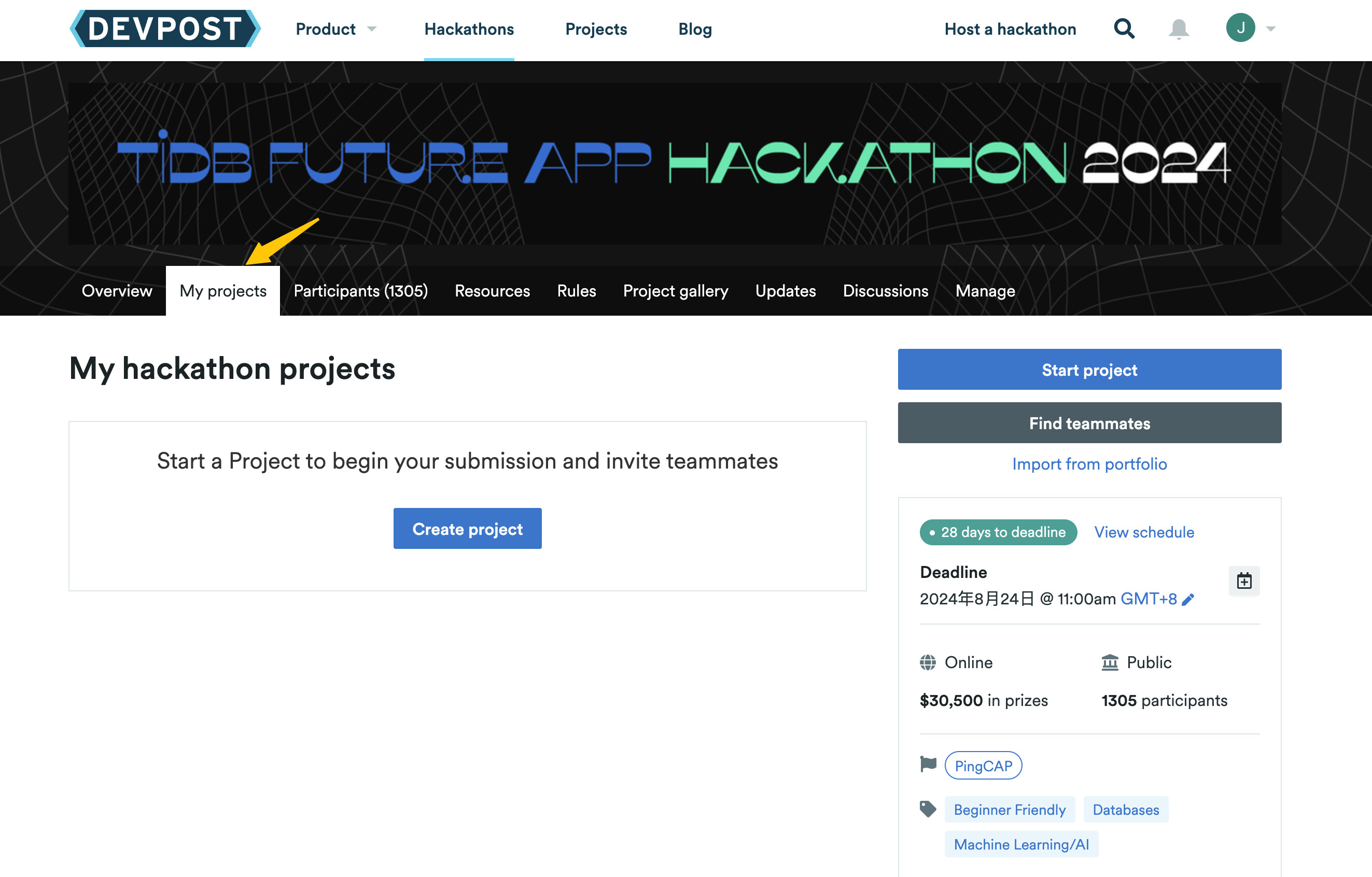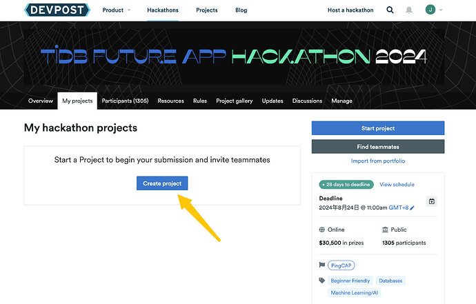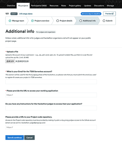 不要忘记提交您的 APP 访问链接。您必须提供一个 GitHub 代码库链接,并通过将其公开或与 hackathon-judge@pingcap.com 共享访问权限。