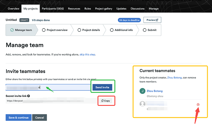 邀请完毕后您的队友信息会自动出现在右侧 Current teammates 处,无需队友确认(如果需要移除,只需点击❎即可)