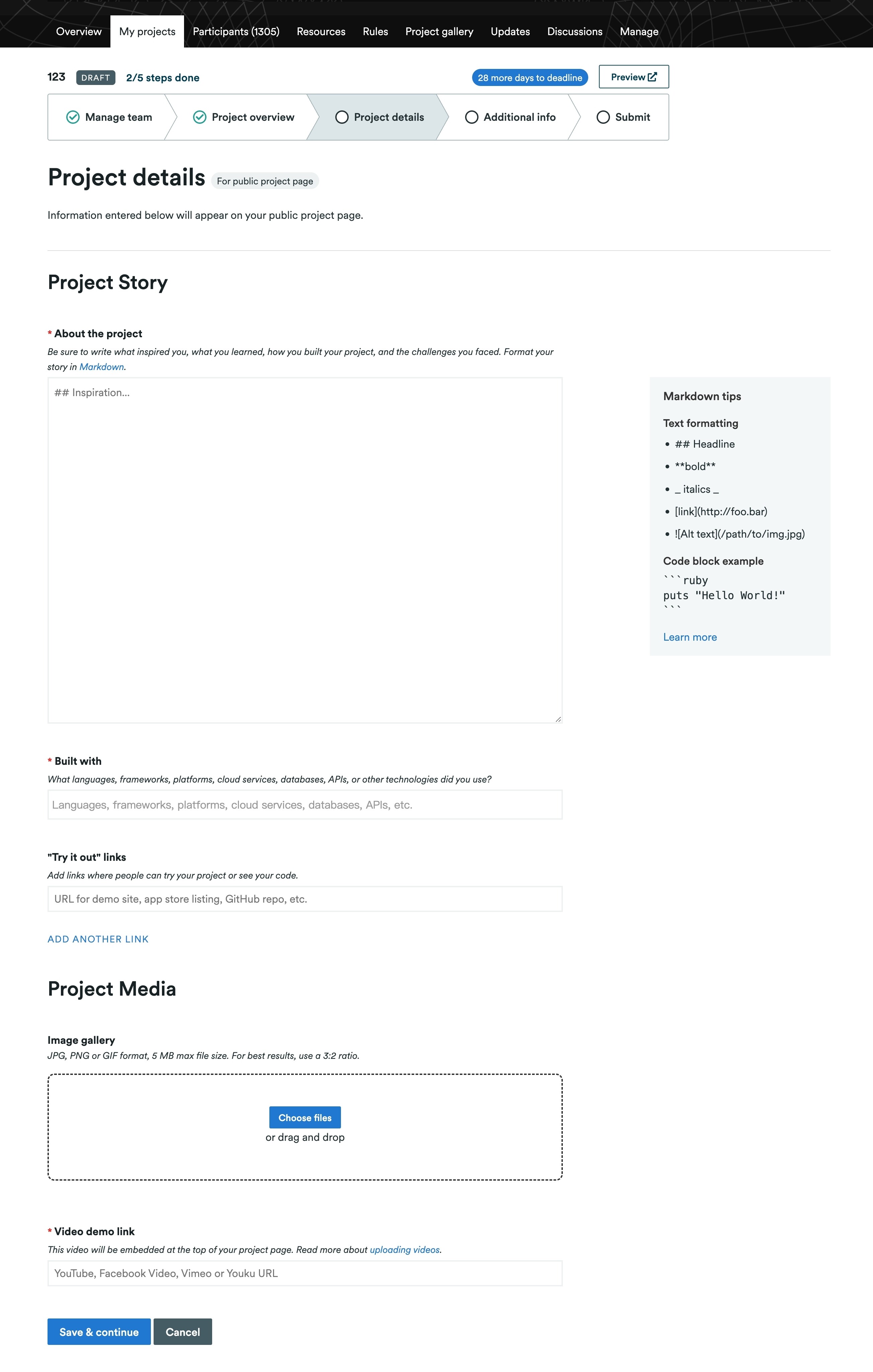 关于作品提交说明:在提交期结束之前(北京时间 8 月 24 日 12:00 前),您可以将提交的项目草稿版保存在 Devpost 上,然后提交至 Hackathon 项目组进行作品评估。提交期结束后,您可能不会对提交的材料进行更改,但您可以继续更新 Devpost 中的项目。