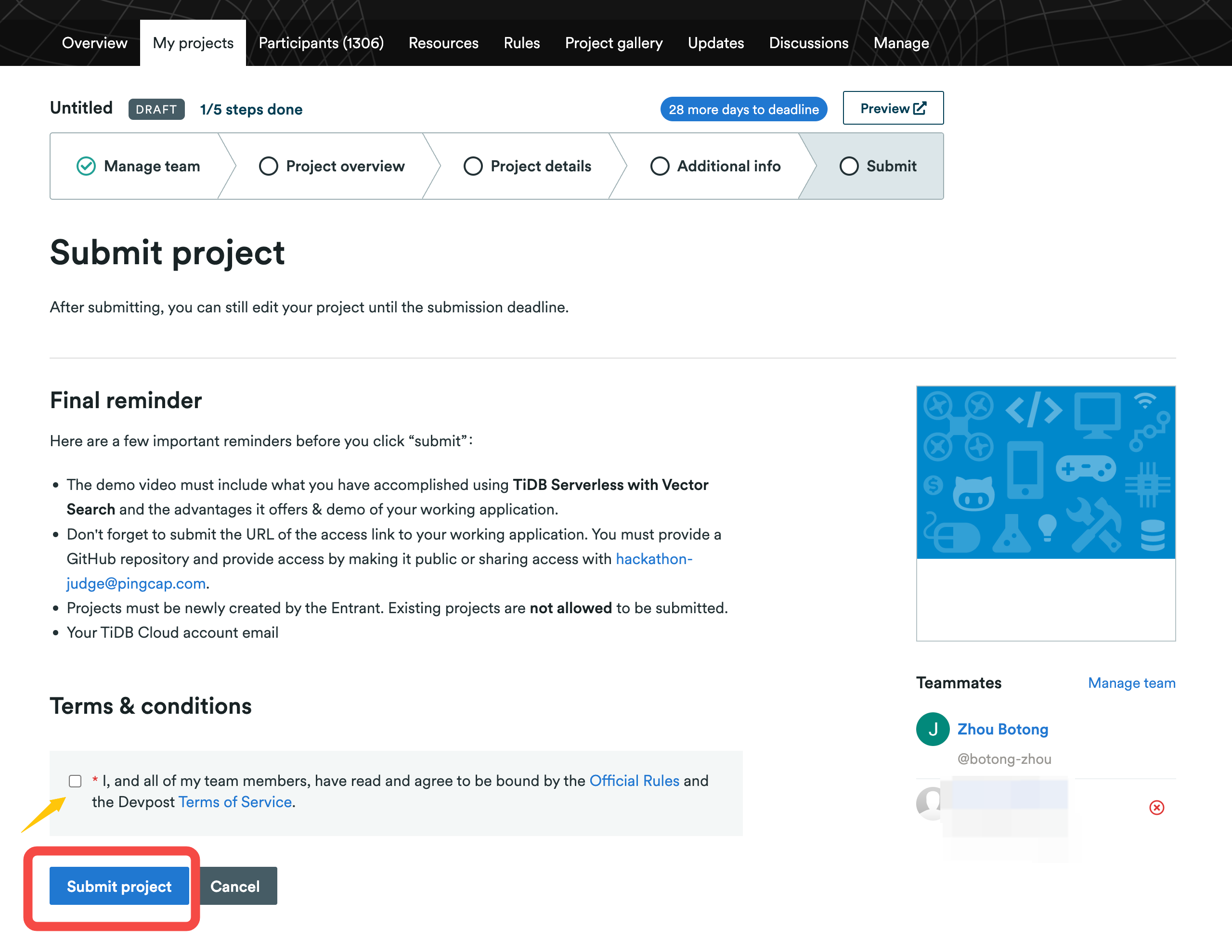 项目提交分两步:点击同意条款 + 点击提交项目(Submit Project)即可完成项目提交