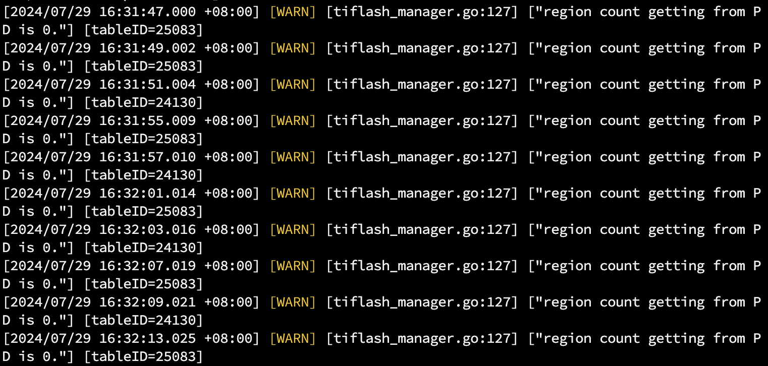 【复现路径】部署了一个TiFlash节点,并为一些表设置了TiFlash副本,数量为1,然后TiDB中出现了以下日志:
