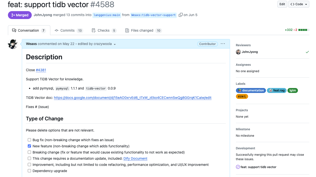 但是这个 Feature 引来了不少的关注,TiDB Vector 的运营和产品同学也很快联系了我,确实有点受宠若惊。并且TiDB Vector 还主动和 Dify 那边的研发联系推进这个 Feature 的合入等等。突然受到了不小的关注hhhh ![]()