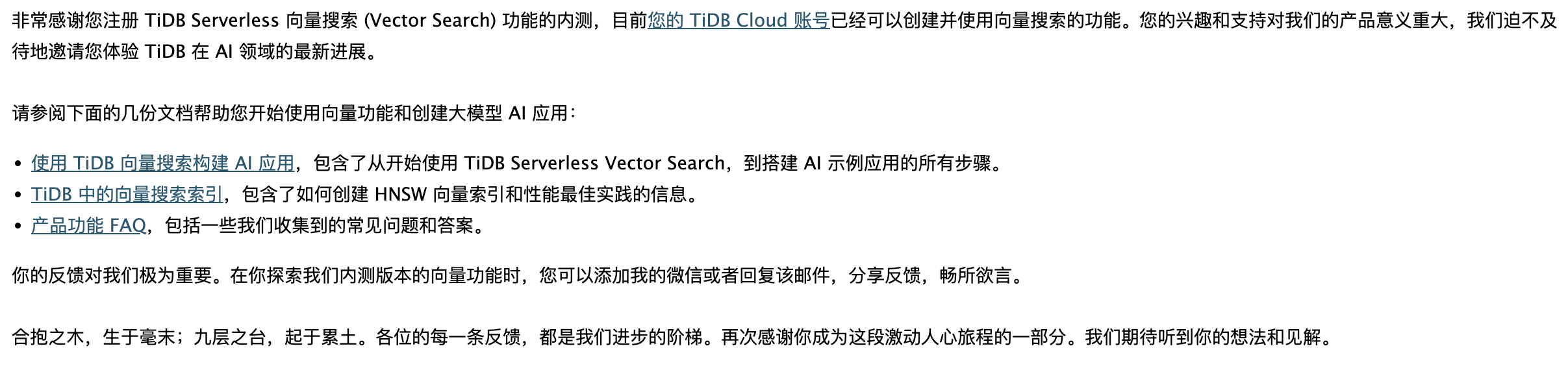 最后的最后,借用 TiDB Vector 内测通过的邮件中的一句话: