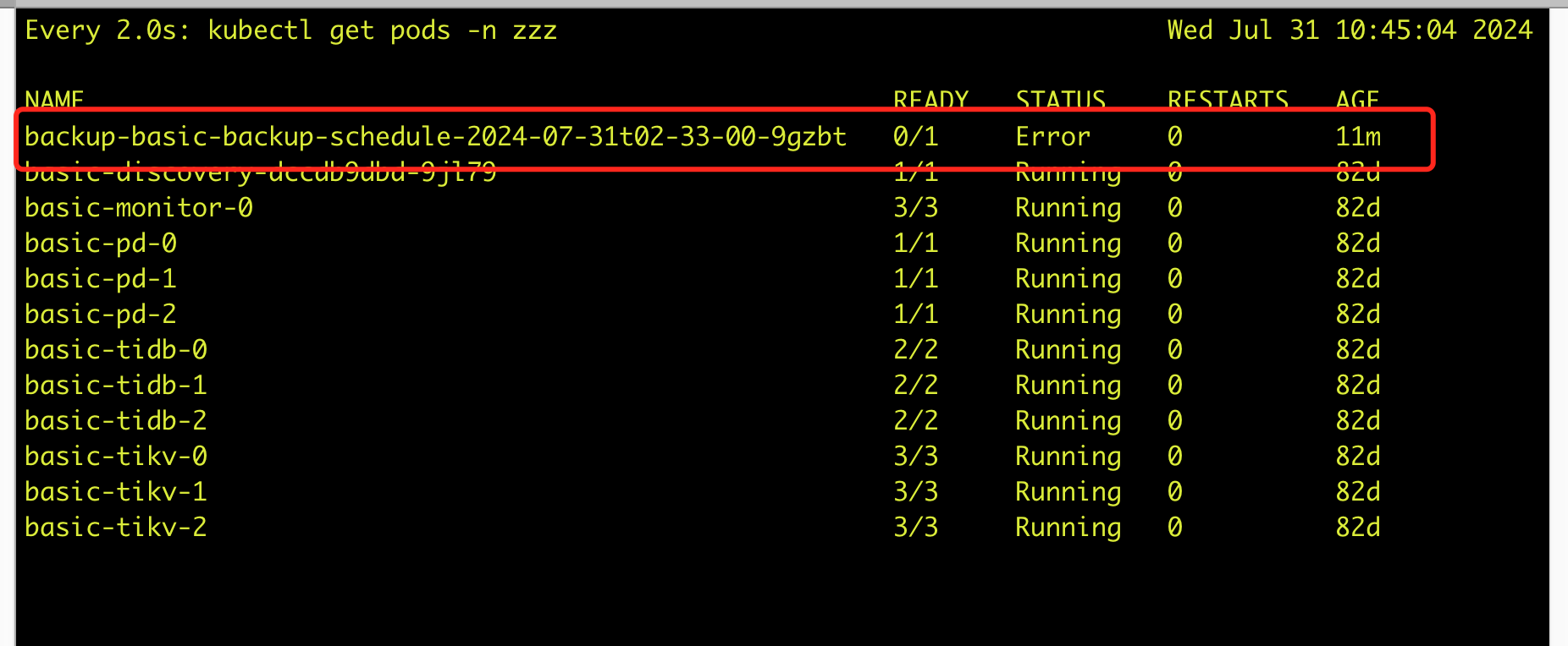I0731 10:33:10.188280 1 event.go:282] Event(v1.ObjectReference{Kind:“Backup”, Namespace:“zzz”, Name:“basic-backup-schedule-2024-07-31t02-33-00”, UID:“3a918b16-529c-4e4b-857b-a07e76f932f5”, APIVersion:“pingcap.com/v1alpha1”, ResourceVersion:“249655598”, FieldPath:“”}): type: ‘Normal’ reason: ‘SuccessfulCreate’ create Backup zzz/basic-backup-schedule-2024-07-31t02-33-00 for backupSchedule/basic-backup-schedule successful