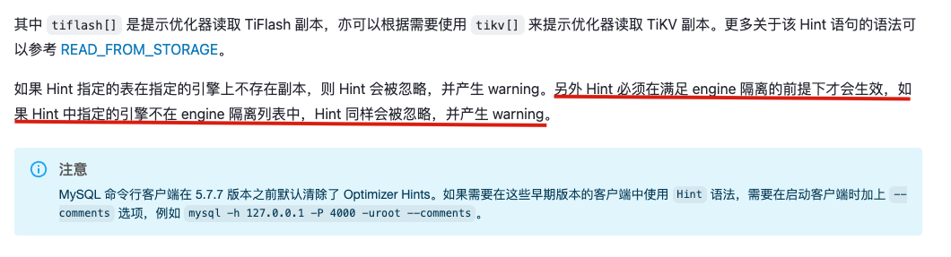 MySQL 命令行客户端在 5.7.7 版本之前默认清除了 Optimizer Hints。如果需要在这些早期版本的客户端中使用 Hint 语法,需要在启动客户端时加上 --comments 选项。例如 mysql -h 127.0.0.1 -P 4000 -uroot --comments 。