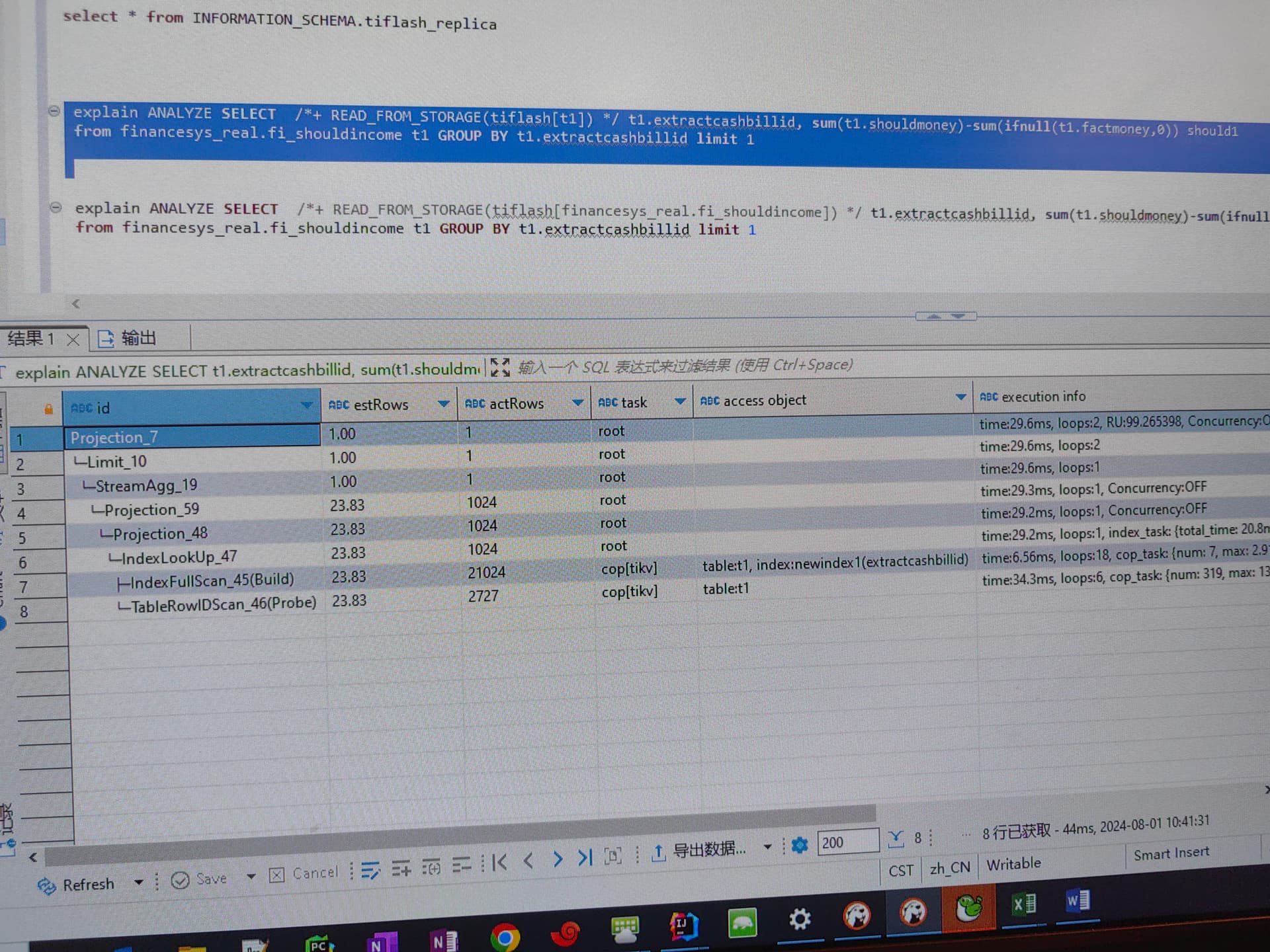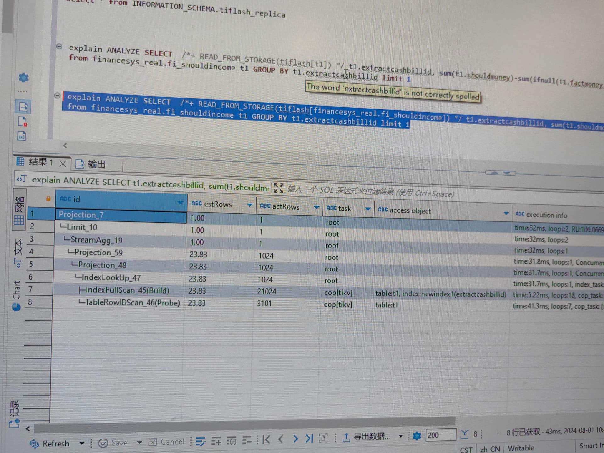 2、你的取了别名,连接的时候用的不是表所属的数据库,需要在别名前把数据库名也指定,如t1表在db_name1数据库,而t2表在db_name2 ,写法应是 /*+ READ_FROM_STORAGE(TIFLASH[db_name1.t1], TIKV[db_name2.t2]) */