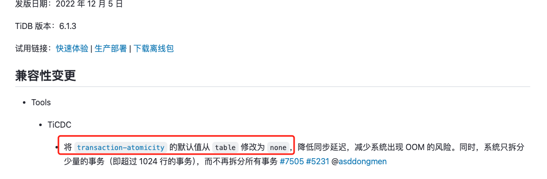 如果是限流导致的,那很有可能跟这个变更有关系。6.1.3默认会拆分事务,同步效率有了大幅度的提升,可以继续将 transaction-atomicity设置为table,降低同步速度 ![]()