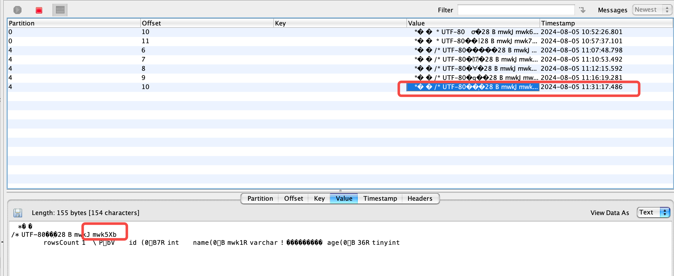 表现为 mwk5 表的插入可以在 kafka 查询到