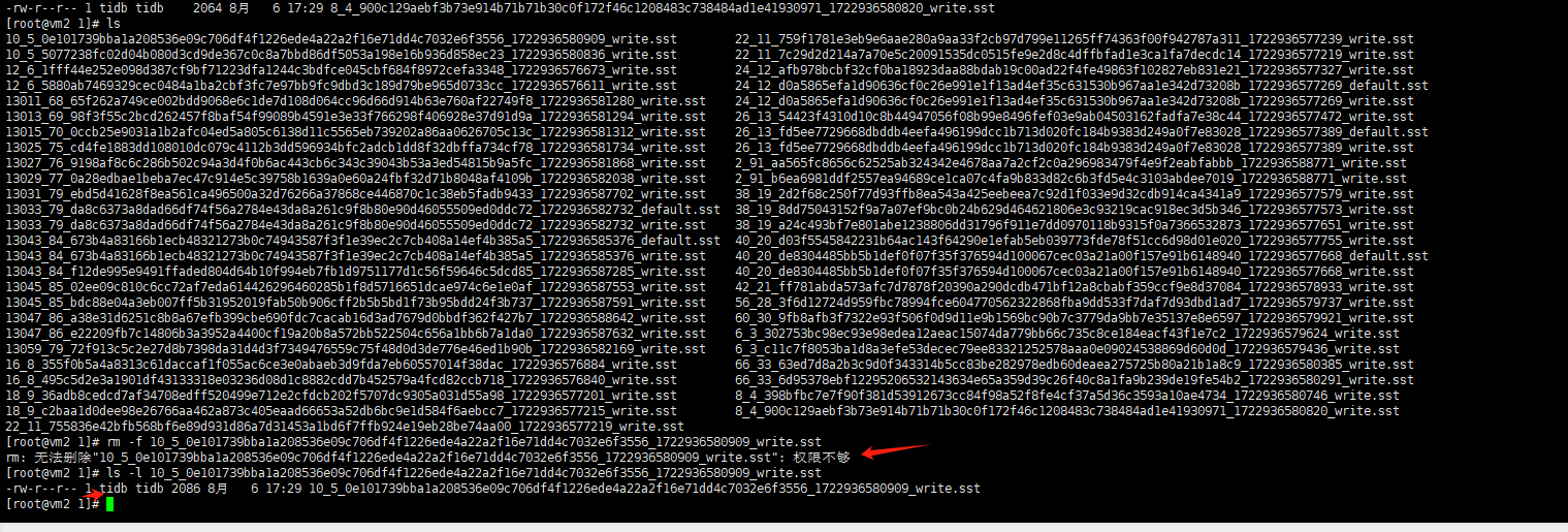 【遇到的问题:问题现象及影响】删除备份目录。提示其中有些文件权限不足无法删除。因为使用的root用户进行删除,所以很奇怪怎么会没有权限删除呢。虽然后来使用了TIDB用户删除了数据,但是还是感觉怪怪的