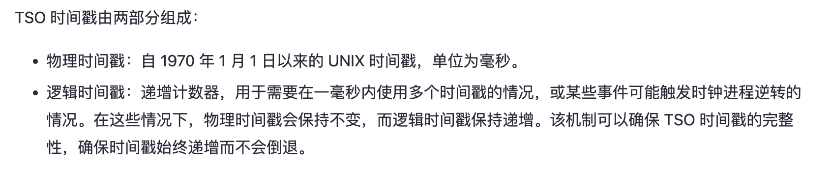 由两部分组成:高48位是物理部分,表示Unix时间的毫秒数;低18位是逻辑部分,是一个数值计数器,用于在物理时间相同的情况下区分不同的TSO