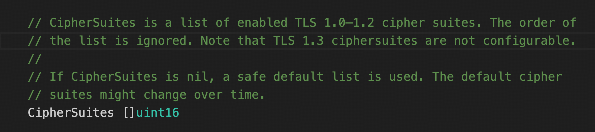以下为TiDB的依赖go的crypto库,默认情况下加密算法套件是go判定安全的加密算法套件。