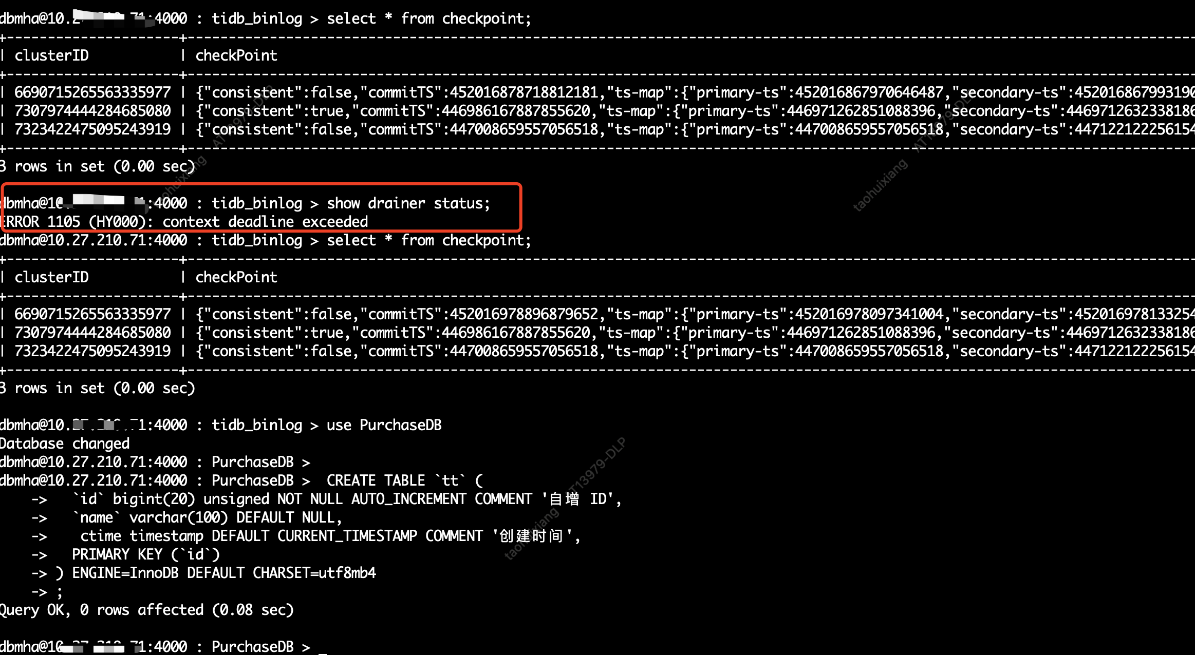 现象: show drainer status;出错ERROR 1105 (HY000): context deadline exceeded