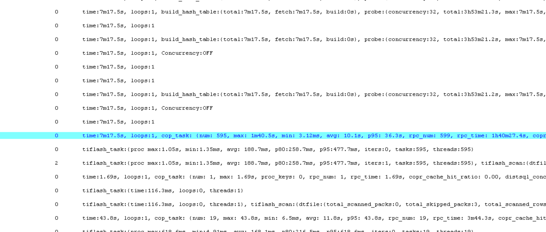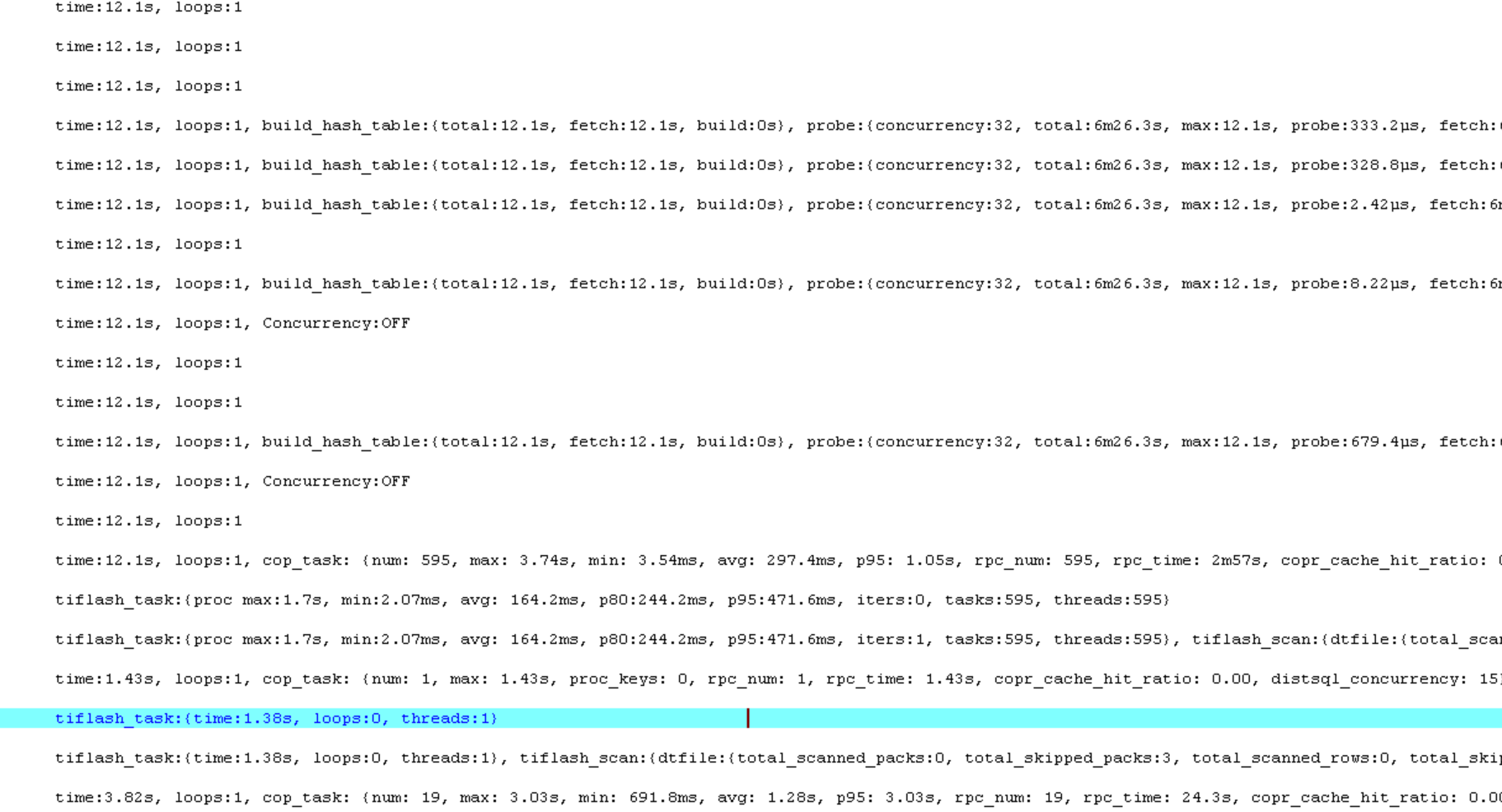 2.Tiflash也是MPP架构 所有MPP都天然有架构上的不足 当数据分布不均衡也就是有数据倾斜时 会导致单节点负载过高 外在表现就是集群变慢 实际上其它节点全部在等待数据倾斜节点作业完成再进行下一步 如果数据倾斜特别严重 还可能导致执行资源被长期占据 而其它作业因拿不到执行资源处理队列等待状态 此时的外在表现则是集群异常缓慢 而实际上是大部分作业处理等待状态根本未执行