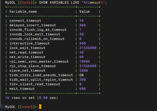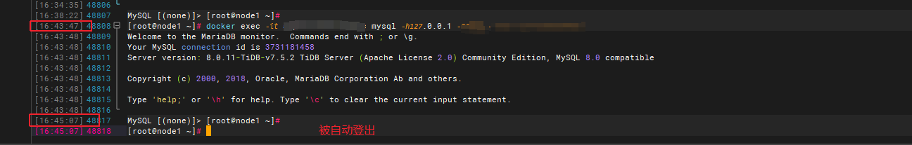 【现象二】:tidb日志一直打印“ [INFO] [conn.go:1048] [“read packet timeout, close this connection”] [conn=3731180098] [session_alias=] [idle=10m0.000528797s] [waitTimeout=600] [error=“read tcp 127.0.0.1:9486->127.0.0.1:64494: i/o timeout”]”