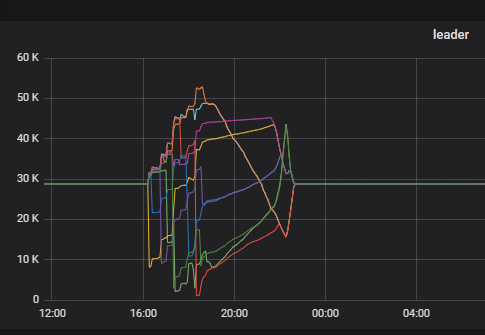 建议排查下,在开始阶段leader大幅减少的tikv节点日志,怀疑是发生了故障,导致leader全部下线了。