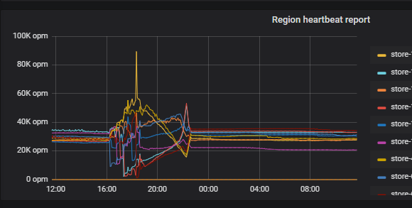这cpu不是都快100%了。。。我看你先确认下你的tikv节点有没有重启吧。。。