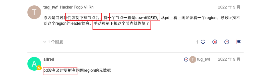 现在就很矛盾,按照 小龙虾的指导命令检查后显示 All regions are healthy. 但是备份时候报错 [2024/09/05 17:43:32.124 +08:00] [ERROR] [main.go:60] [“br failed”] [error=“can not find a valid leader for key t\ufffd\u0000\u0000\u0000\u0000\u0000\u000b\ufffd5_r\u0003\ufffd\u0000\u0000\u0000\ufffd\u0000\ufffd\ufffd\ufffd\u0003\ufffd\u0000\u0000\ufffd\u0000\u0000\u0000\u0000\ufffd\u0003\ufffd\u0000\ufffd\u0000\u0000\u0000\u0000\u0001\ufffd\u0000\u0000\ufffd: [BR:Backup:ErrBackupNoLeader]backup no leader”] [errorVerbose=“[BR:Backup:ErrBackupNoLeader]backup no leader\ncan not find a valid leader for key t\ufffd\u0000\u0000\u0000\u0000\u0000\u000b\ufffd5_r\u0003\ufffd\u0000\u0000\u0000\ufffd\u0000\ufffd\ufffd\ufffd\u0003\ufffd\u0000\u0000\ufffd\u0000\u0000\u0000\u0000\ufffd\u0003\ufffd\u0000\ufffd\u0000\u0000\u0000\u0000\u0001\ufffd\u0000\u0000\ufffd\ngithub.com/pingcap/tidb/br/pkg/backup.(*Client).findTargetPeer\n\t/home/jenkins/agent/workspace/build-common/go/src/github.com/pingcap/br/br/pkg/backup/client.go:1025\ngithub.com/pingcap/tidb/br/pkg/backup.(*Client).handleFineGrained\n\t/home/jenkins/agent/workspace/build-common/go/src/github.com/pingcap/br/br/pkg/backup/client.go:1228\ngithub.com/pingcap/tidb/br/pkg/backup.(*Client).fineGrainedBackup.func2\n\t/home/jenkins/agent/workspace/build-common/go/src/github.com/pingcap/br/br/pkg/backup/client.go:1080\nruntime.goexit\n\t/usr/local/go/src/runtime/asm_amd64.s:1598”] [stack=“main.main\n\t/home/jenkins/agent/workspace/build-common/go/src/github.com/pingcap/br/br/cmd/br/main.go:60\nruntime.main\n\t/usr/local/go/src/runtime/proc.go:250”]