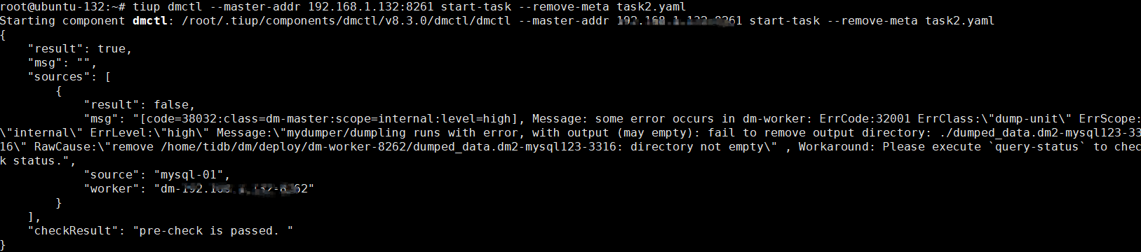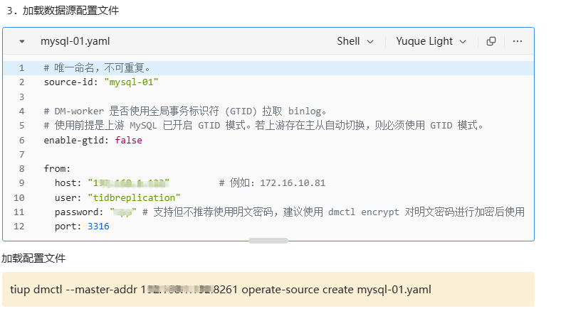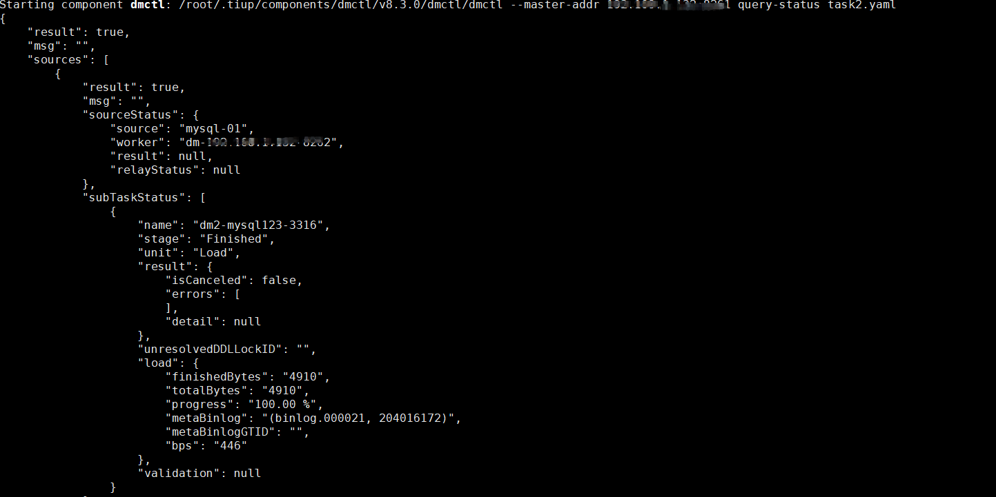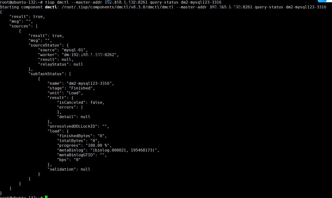 【复现路径】作为首次接触的新手,按照官网技术手册使用TiUP在单个主机上搭建了一个最低配的TiDB集群和TiDM集群,数据库已经能正常访问,现在正在试验从MySQL同步一个测试表到TiDB中。表中有15条测试数据,完全参考了《 从小数据量 MySQL 迁移数据到 TiDB》的操作说明,采用的是全量同步模式