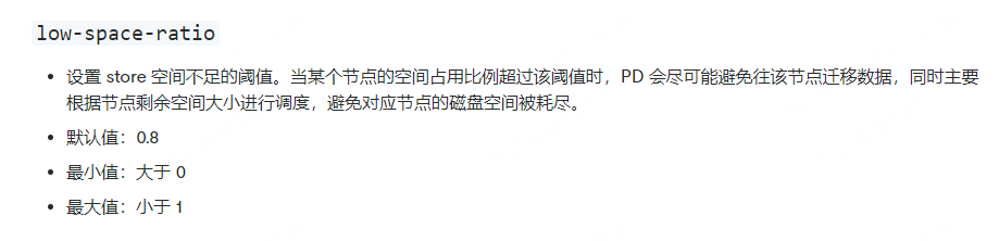 low-space-ratio参数默认值为0.8,即当tikv数据目录所在磁盘的使用率达到80%,则pd会尽量避免继续往该节点写入数据