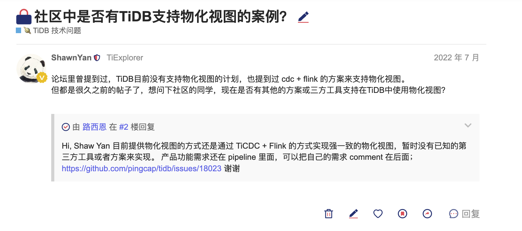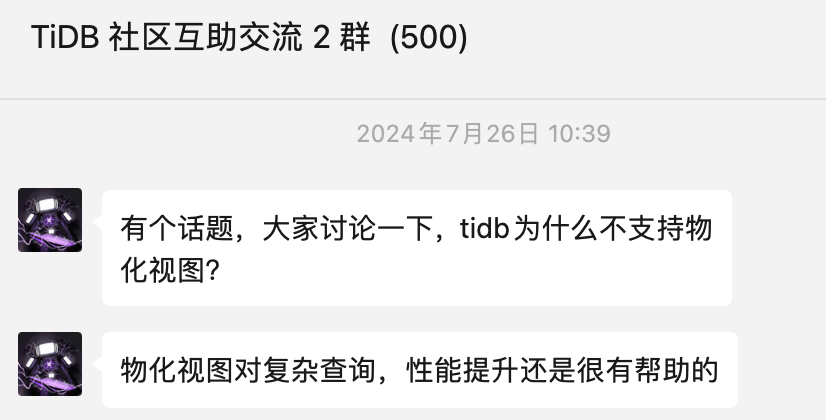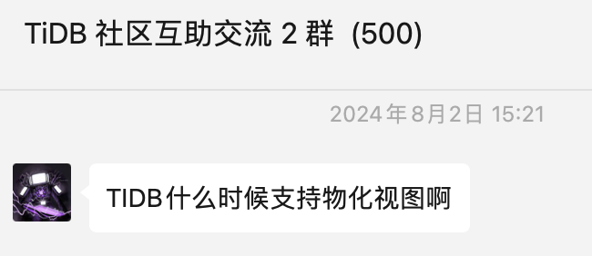 需求还挺强的,我们系统用tidb作为从库,又肩负着数据仓库,支持物化视图能减少相当大的开发工作。