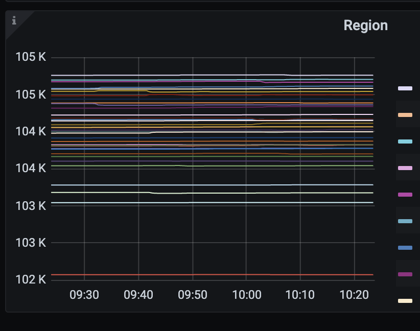 在grafana查看 Region 的状态,包括 Region 的健康状况、Leader 分布情况等。所有 Region 都处于健康状态,并且没有异常的 Leader 缺失,可以作为恢复完成的一个信号