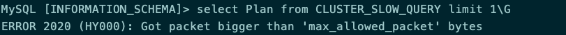 max_allowed_packet已经调整为1G了,但是依旧不够,应该是为了维护plan的格式,导致了这里面的空格字符被放大了无数倍,整体的信息放大了无数倍,不清楚该如何规避