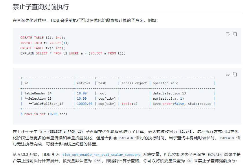 在查询优化过程中,TiDB 默认会提前执行可以在优化阶段直接计算的子查询。