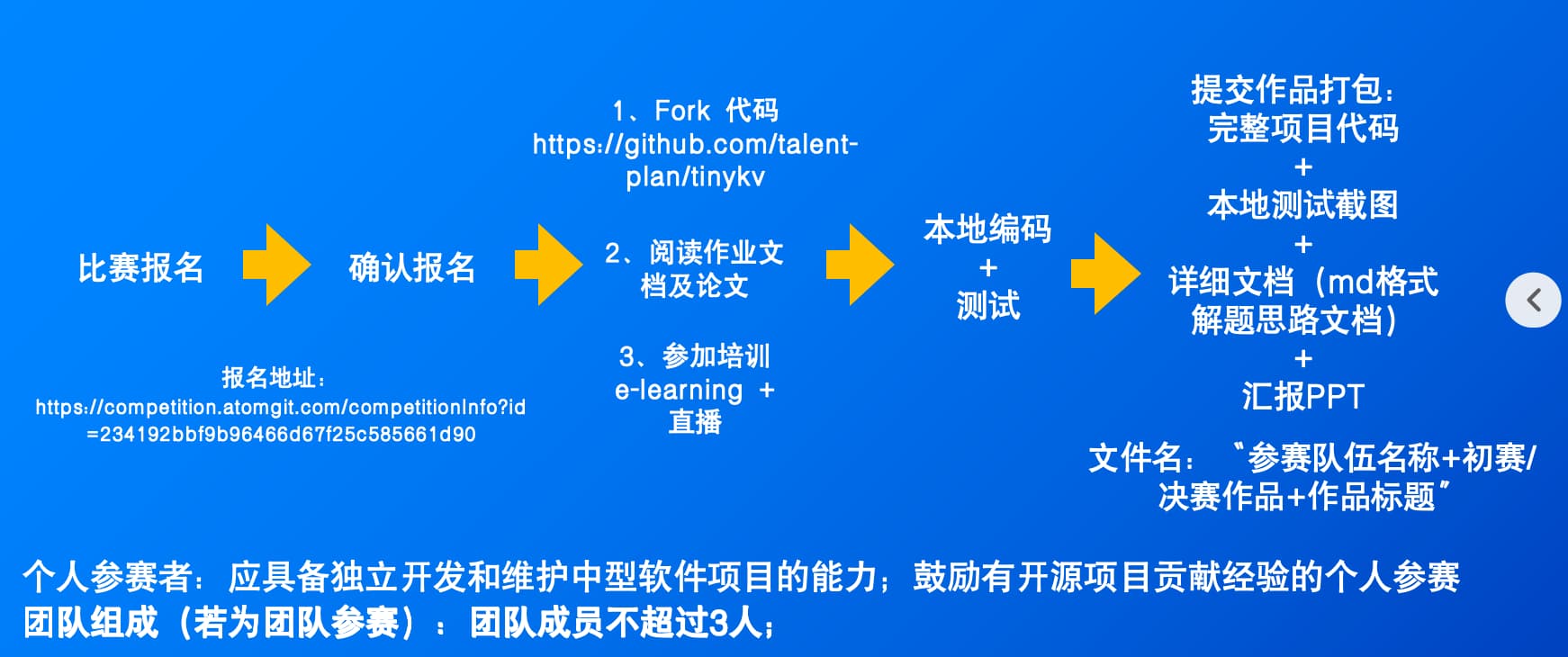 选择本次赛题《 TP 302: TinyKV, a distributed key value database in Go》 课程跳转到 TinyKV Github repo, 参赛选手 fork 课程到自己 repo 完成课程,提交完整作业到指定 Atomgit 参赛选手提交 repo。