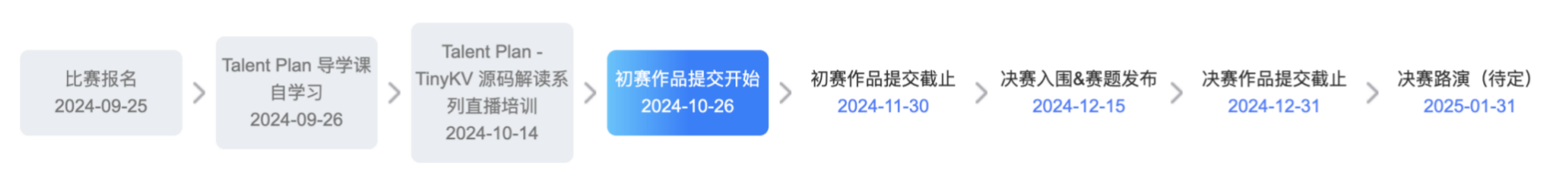 选手初赛以完成 TinyKV 既定赛题为基准,决赛将在初赛入围的基础上开展性能测试、调优、功能丰富等进阶任务的挑战。