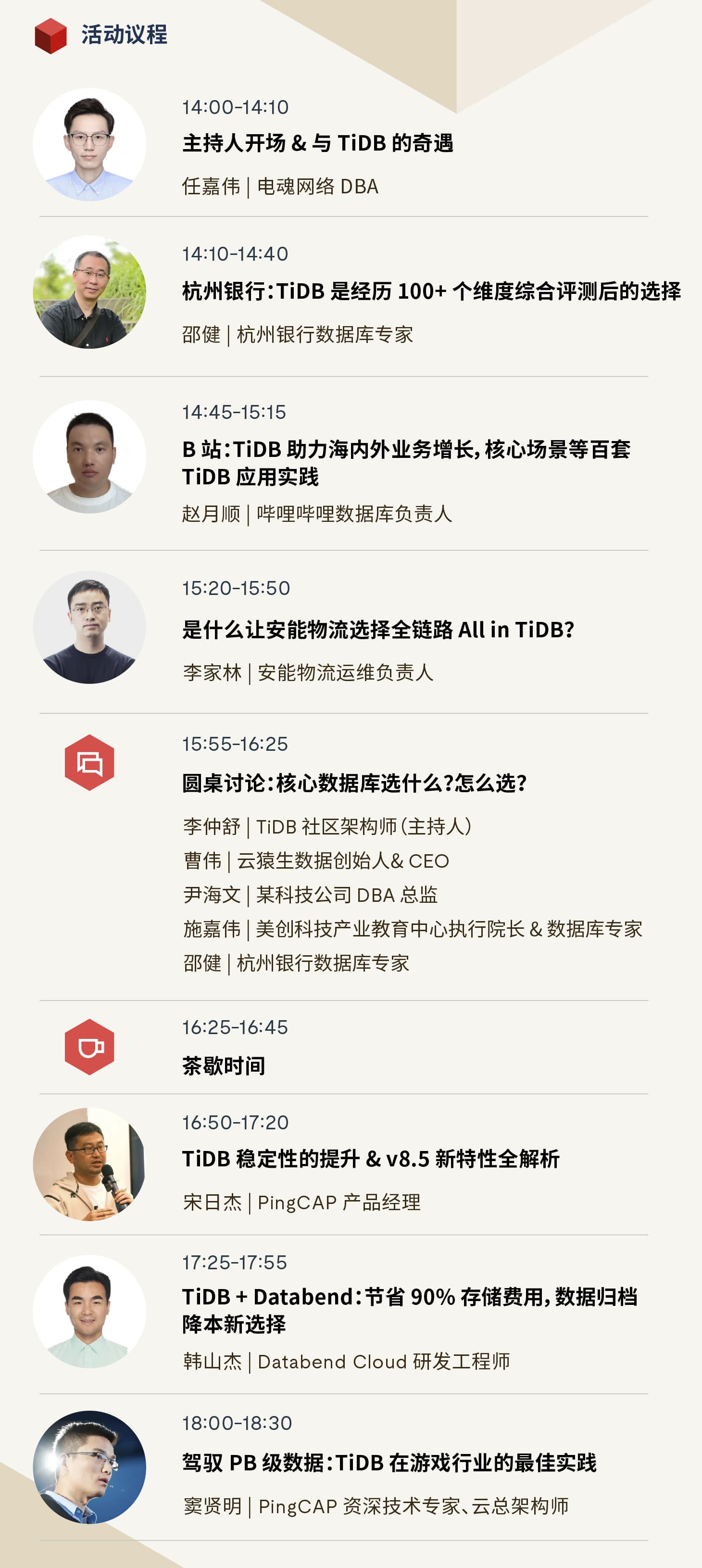 各位 TiDBer 好呀!十月的 TiDB 地区交流活动即将在杭州拉开序幕啦!期待大家的参与!本次活动,我们走进电魂网络,邀请了电魂网络、杭州银行、bilibili、安能物流、Databend、云猿生、美创科技、PingCAP 等 10+ 位资深 TiDB 专家老师和我们一起分享和探讨:核心系统上 TiDB 的收益和体验、多业务场景怎么在 TiDB 一站式实现、TiDB 新版本在稳定性上做了哪些提升和优化、怎么用更好的数据归档方案进行降本、TiDB 在游戏行业的最佳实践、核心数据库究竟该怎么选等等!欢迎感兴趣的小伙伴参加!!