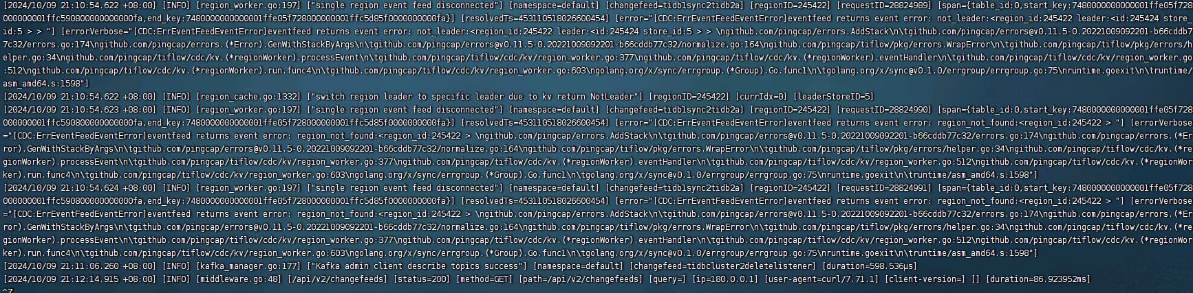 【遇到的问题:问题现象及影响】当启动了一个CDC任务后,checkpoint_time不会向前推进,查看日志大量报region_not_found的错误,如下图: