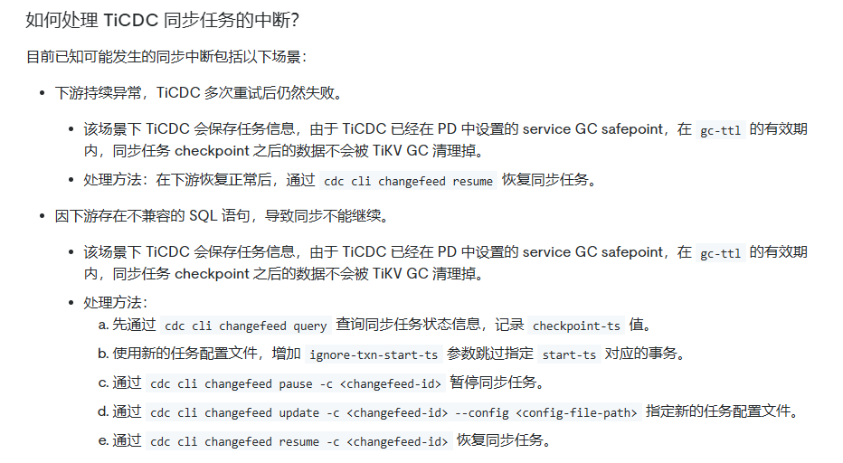 但是 7.1.1 有 bug 可能会在上游 region 产生变动时引起同步中断无法自动恢复,这时候可以通过手动重启 changefeed 进行恢复。