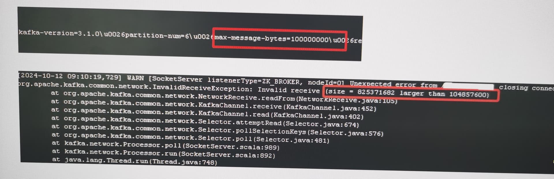 错误来自于 nio 层,调大 socket.requet.max.bytes 参数。