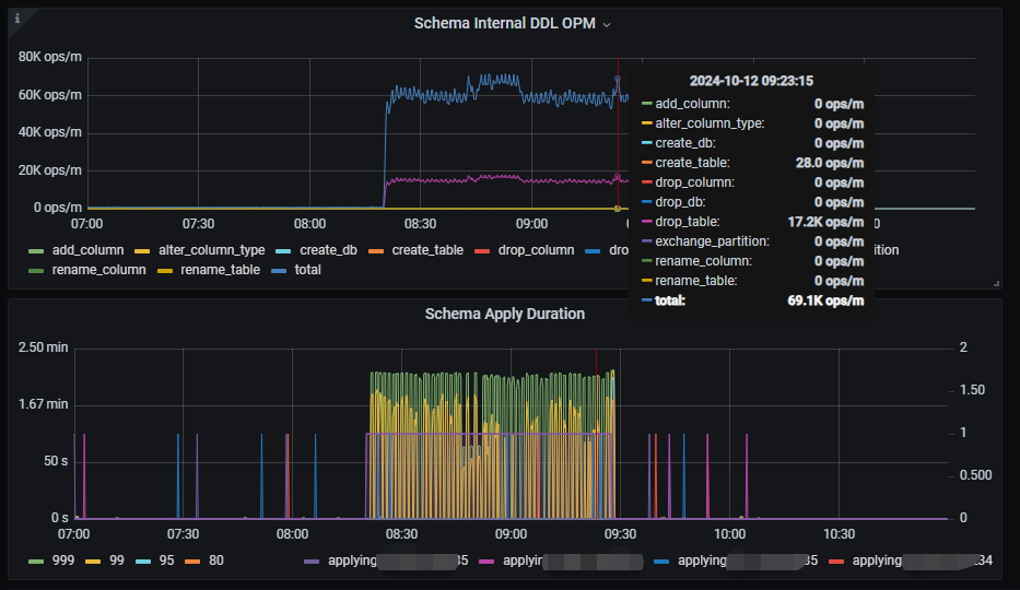 程序端在批量跑大量ddl(drop table和create table)时,走了tiflash的查询语句(查询的表没有做ddl)延迟会明显上升,走tikv的查询就没有影响,从tiflash监控看对应时间段DDL OPM很高,schema apply延时很大: