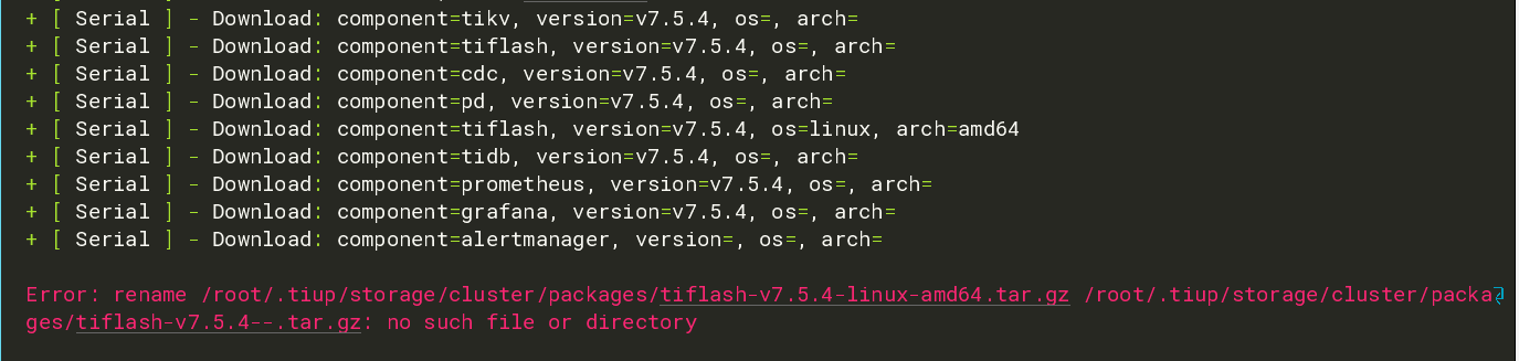 Error: rename /root/.tiup/storage/cluster/packages/tiflash-v7.5.4-linux-amd64.tar.gz /root/.tiup/storage/cluster/packages/tiflash-v7.5.4–.tar.gz: no such file or directory