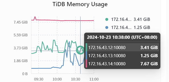 三个节点的集群,32G内存,采用混部的方式部署,三个tidb实例中其中一个实例CPU每分钟周期性的使用率增加,后面定位到是该实例内存超过了tidb_server_memory_limit * tidb_server_memory_limit_gc_trigger 从而触发gc动作导致CPU增加。目前已经避免将SQL请求转发到该tidb实例,但是该实例还是每分钟触发gc,导致cpu增大。虽然可以通过调整tidb_server_memory_limit_gc_trigger 以及tidb_server_memory_limit 来避免GC,但是一旦后续SQL请求转发到节点,还是会导致该节点内存使用超过tidb_server_memory_limit * tidb_server_memory_limit_gc_trigger ,进而继续触发gc。