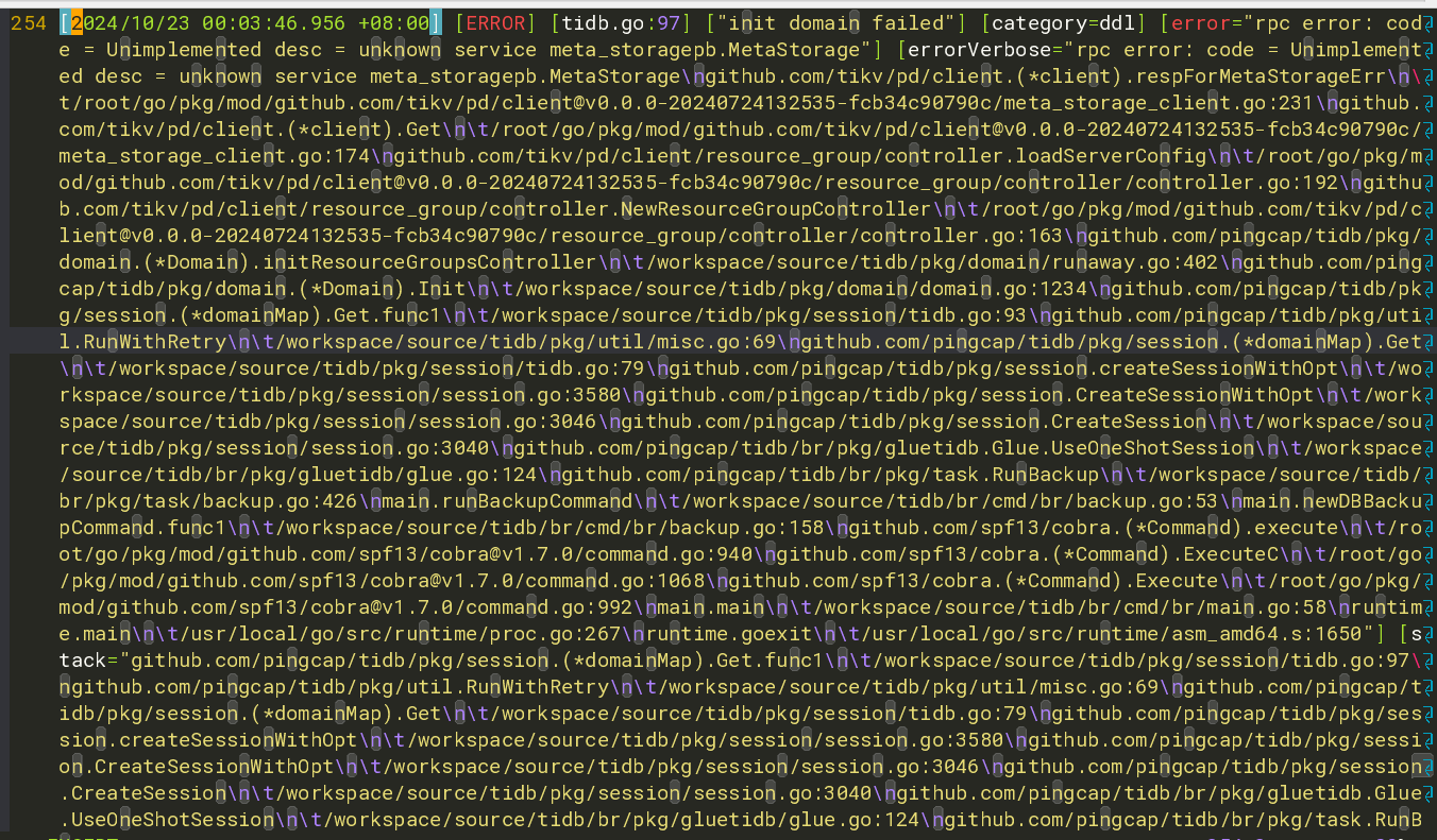 [2024/10/23 00:04:57.077 +08:00] [ERROR] [main.go:60] ["br failed"] [error="rpc error: code = Unimplemented desc = unknown service meta_storagepb.MetaStorage"] [errorVerbose="rpc error: code = Unimplemented desc = unknown servic e meta_storagepb.MetaStorage