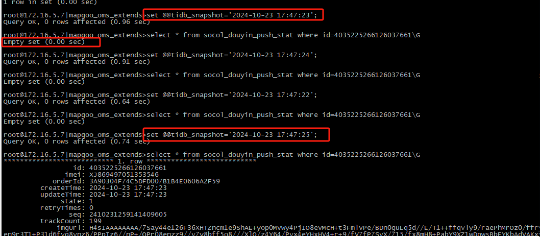 我的理解是这样的,snapshot是数据快照的时间点。数据在最后一次commit后数据才能被读取到。那么这次commit 时间点应该比你binlog的时间点稍微晚一丢丢,也就是24s后。在23s 的快照时间点上,数据其实还未真正的commit,表实际上是没有数据的。