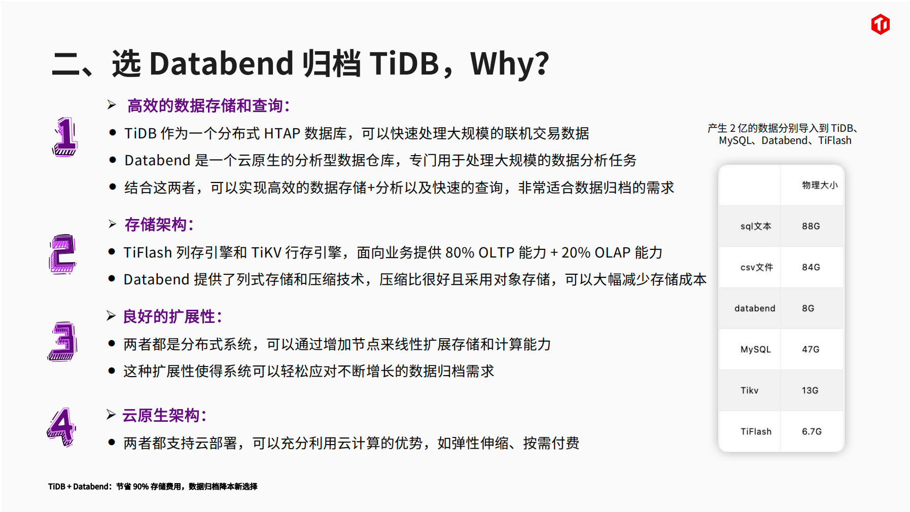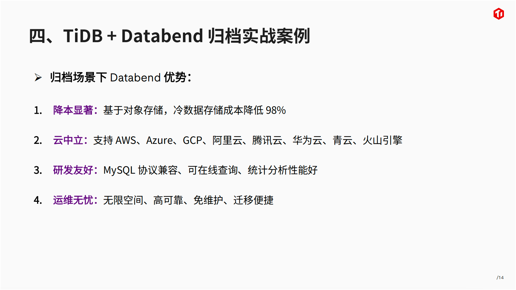 分享主题: TiDB + Databend:节省 90% 存储费用,数据归档降本新选择
