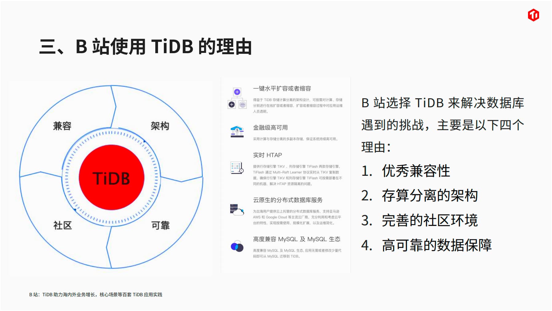 面对业务增长带来的流量压力和数据存储规模的增长,B站选择TiDB主要是因为其优秀的兼容性、存算分离架构、完善的社区环境和高可靠的数据保障。