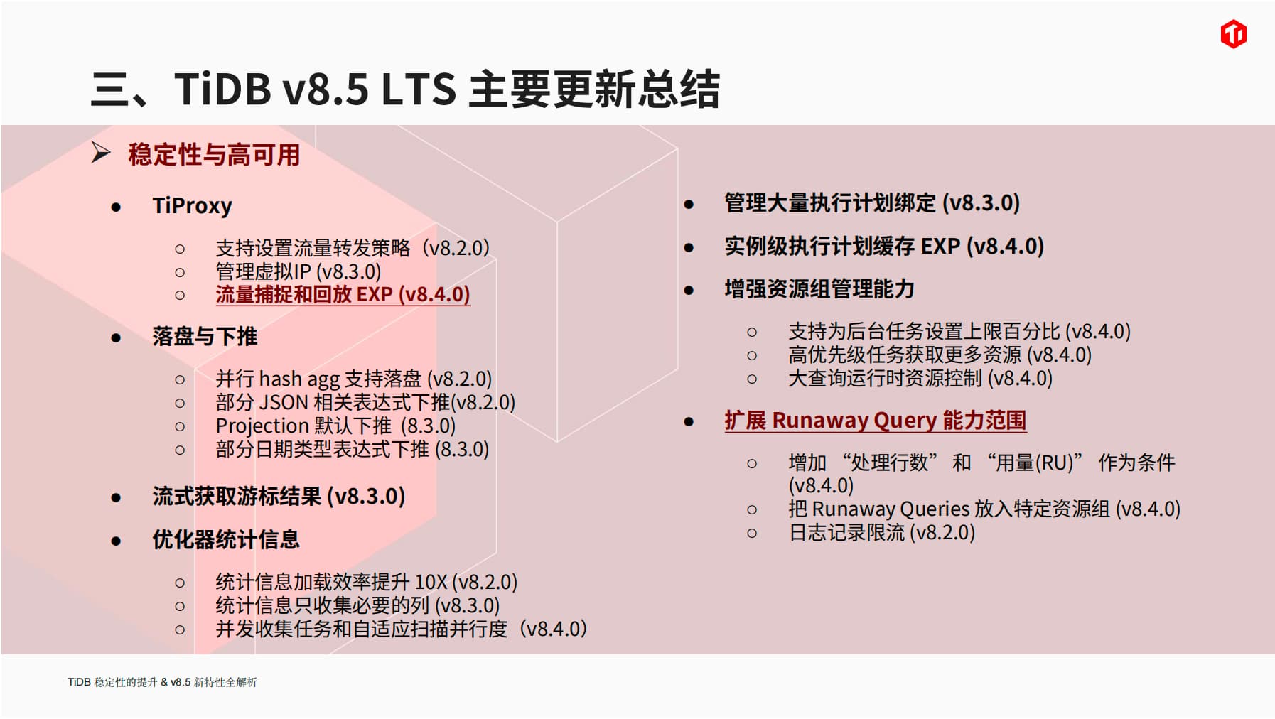 分享主题: TiDB 稳定性的提升 & v8.5 新特性全解析