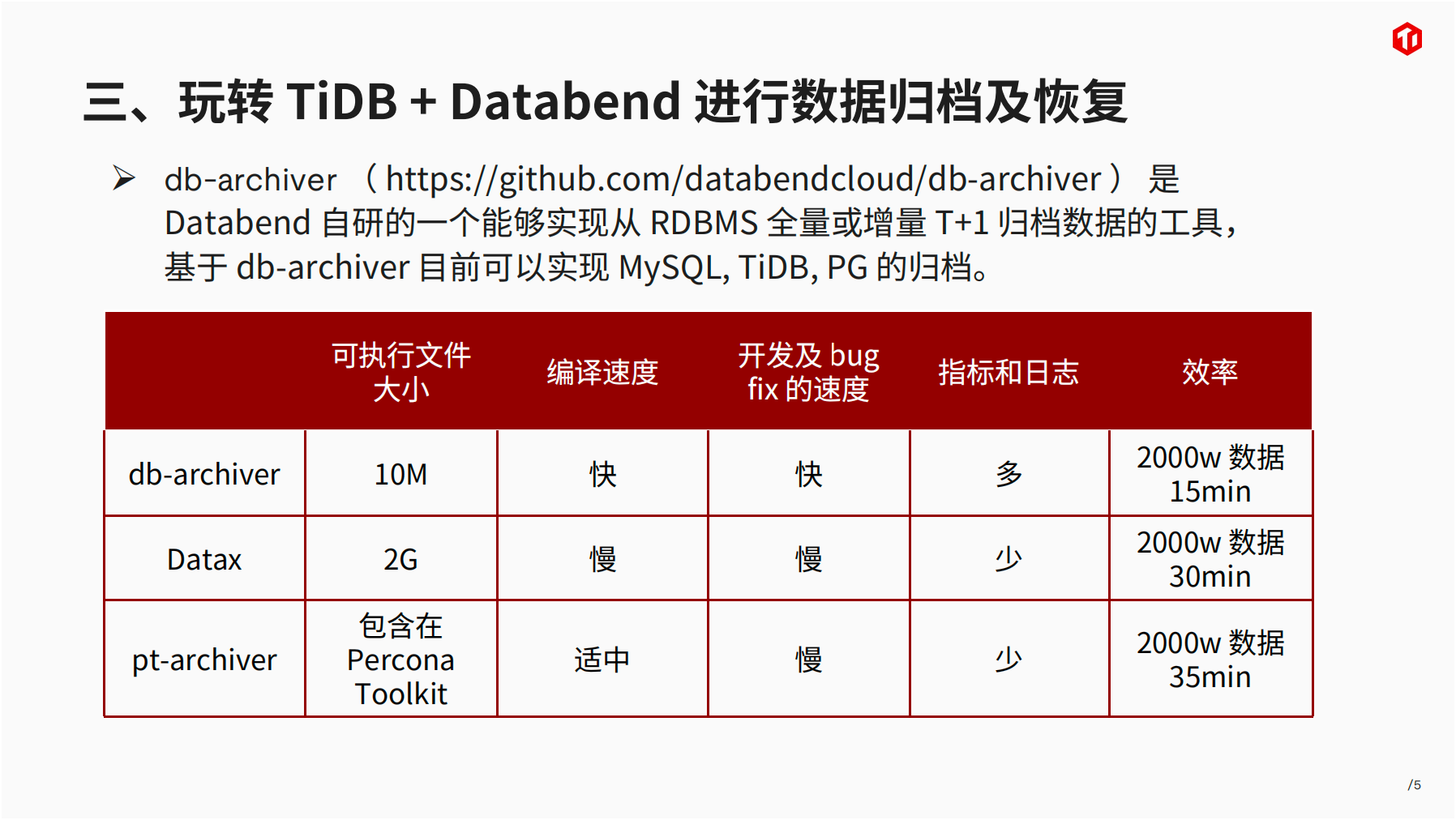资料下载:韩山杰老师-TIDB+Databend:节省90%存储费用,数据归档降本新选择.pdf (3.8 MB)