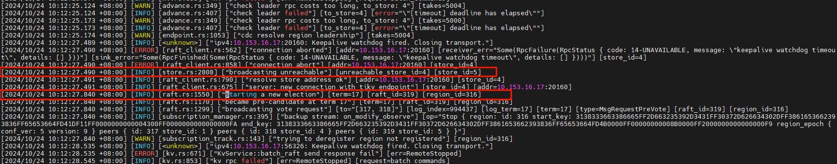 如果真的是27报错之后才开始选举,可以考虑调低grpc-keepalive-time。timeout还是谨慎调整,怕出很多告警,半夜看到也挺吓人的。