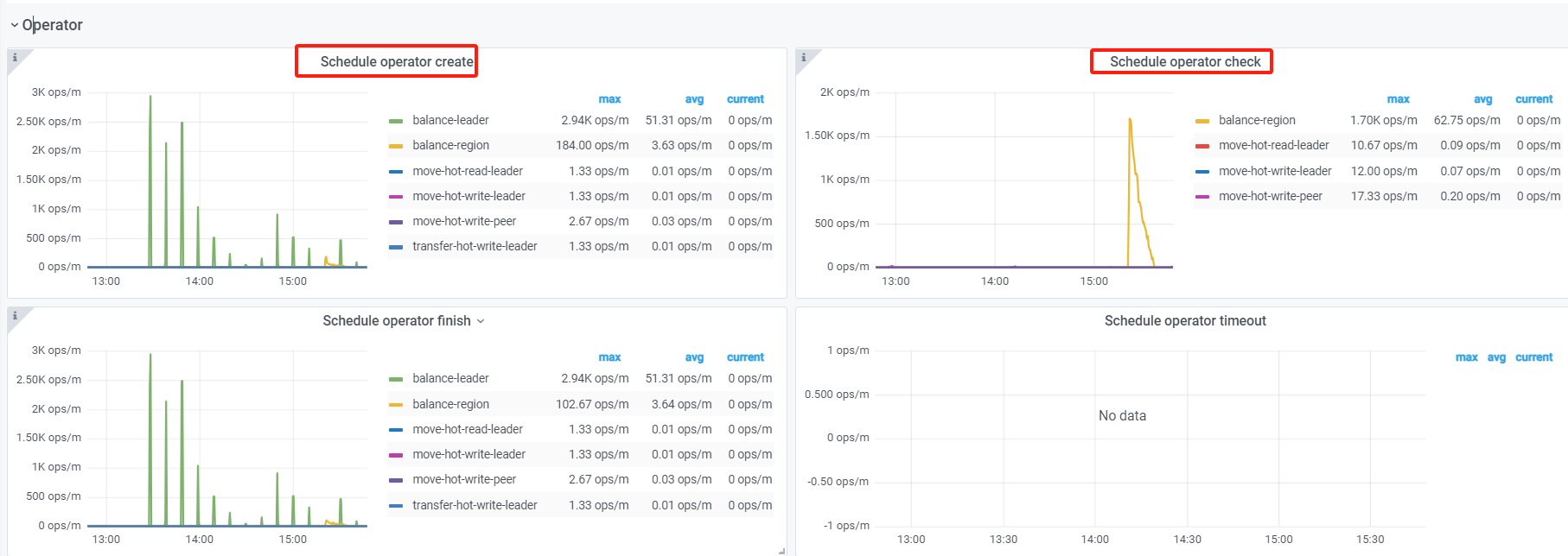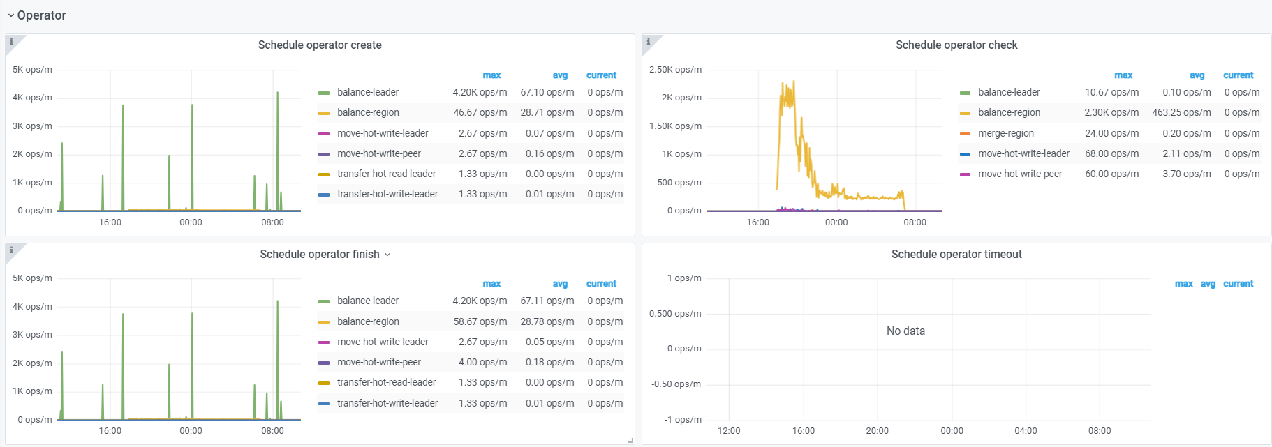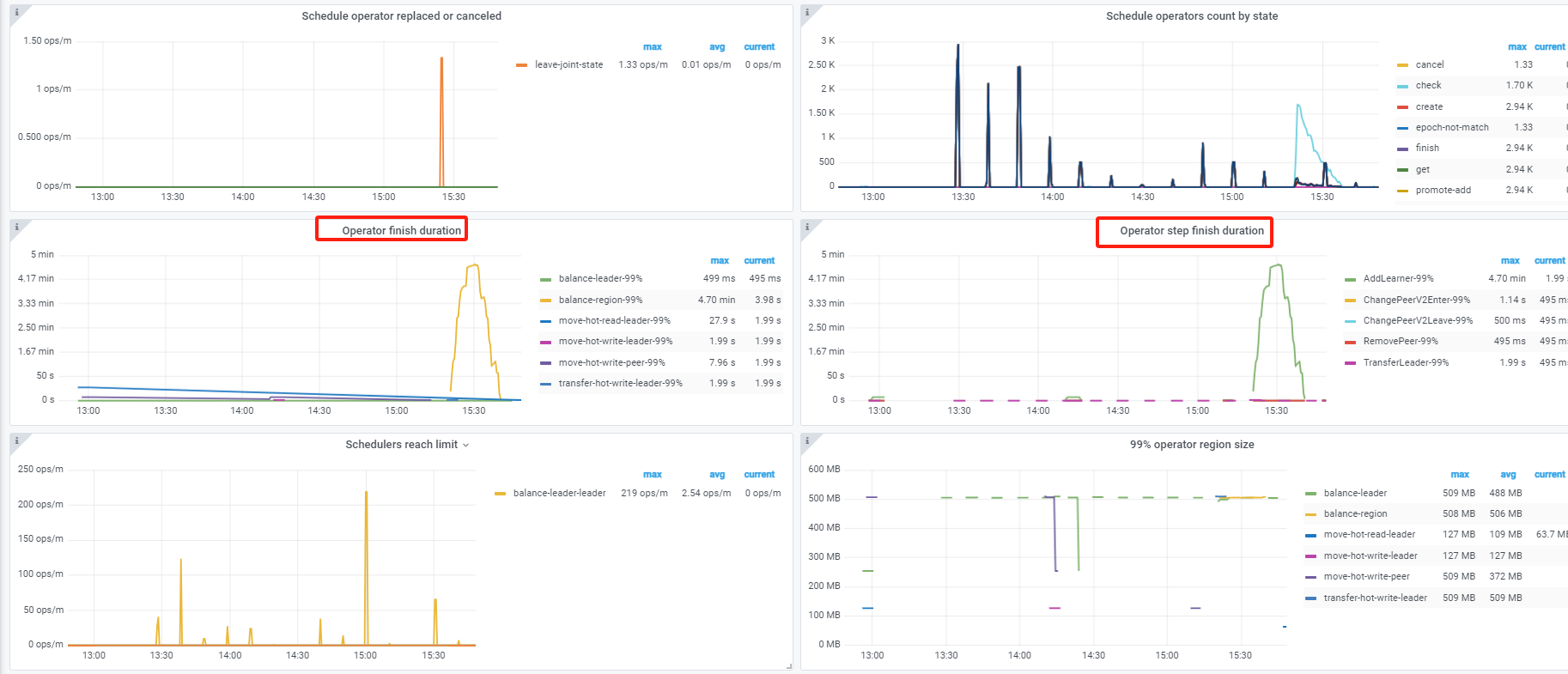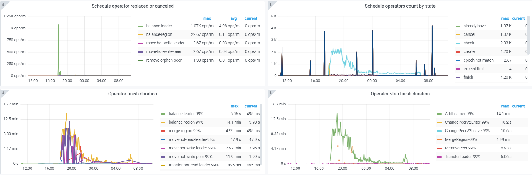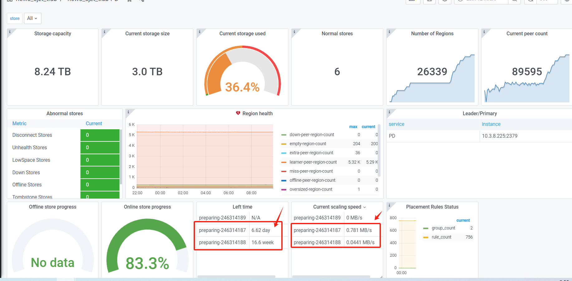 看下pd监控的operator产生和消费正常吗。正常的话先试试调大调度参数 pd-ctl config set 调整 replica-schedule-limit ,max-pending-peer-count 以及 max-snapshot-count 。 pd-ctl store limit all xx 增大store limt。
