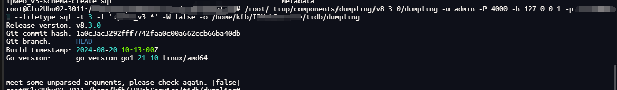 在使用 dumpling 导出数据库时,默认是不会导出 视图 相关的 schema.sql 文件的,后面使用 -W false 时,会提示语句有误,完整语句如:/root/.tiup/components/dumpling/v8.3.0/dumpling -u admin -P 4000 -h 127.0.0.1 -p xxx --filetype sql -t 3 -f ‘v3.*’ -W false -o /home/kfb/v3/tidb/dumpling