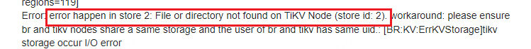 Error: error happen in store 2: File or directory not found on TiKV Node (store id: 2). workaround: please ensure br and tikv nodes share a same storage and the user of br and tikv has same uid.: [BR:KV:ErrKVStorage]tikv storage occur I/O error